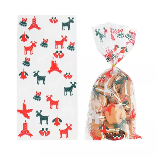 25 darabos karácsonyi mintás celofán zacskó, melybe egyszerűen, de mégis dekoratívan csomagolhatsz karácsonyi meglepetéseket vagy éppen apró süteményeket és bonbonokat.