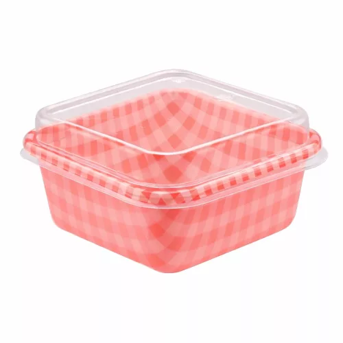 A 3 darabos, rózsaszín színű, kocka mintás műanyag süteményes doboz tetővel praktikus és dekoratív megoldás sütemények, desszertek és kisebb ajándék finomságok tárolására és szállítására. A négyzet alakú kialakítás stabil tartást biztosít, a hozzá tartozó átlátszó fedél pedig megvédi a süteményeket a külső hatásoktól.
