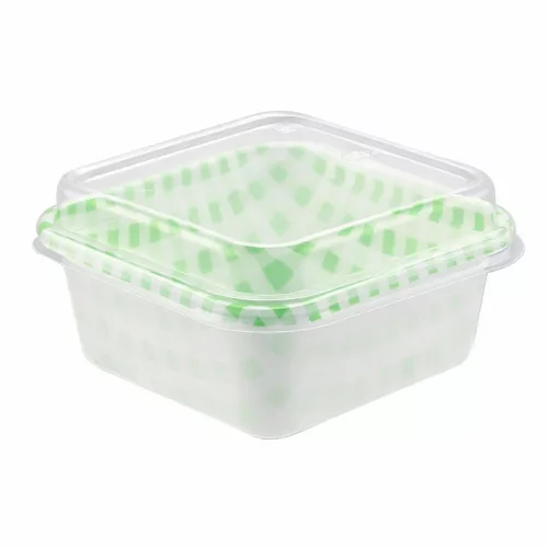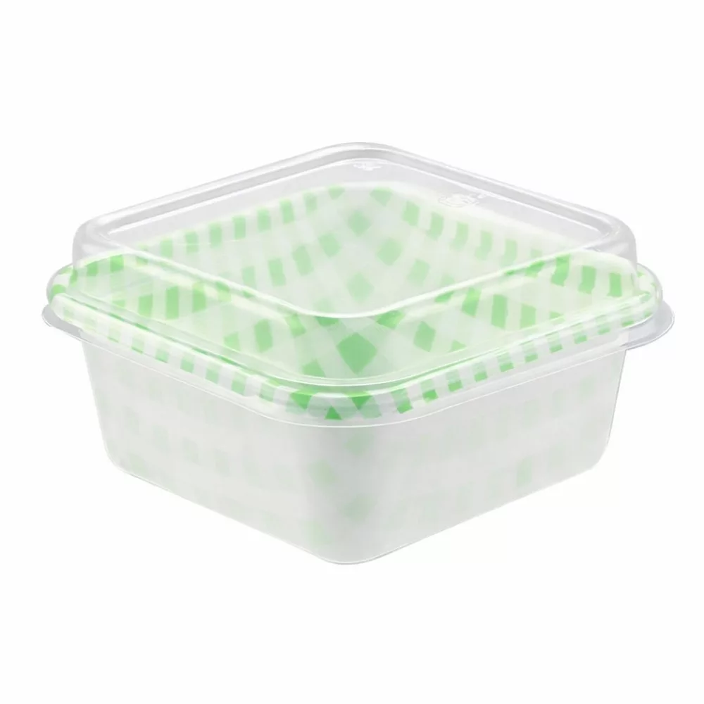 A 3 darabos, zöld színű, kocka mintás műanyag süteményes doboz tetővel praktikus és dekoratív megoldás sütemények, desszertek és kisebb ajándék finomságok tárolására és szállítására. A négyzet alakú kialakítás stabil tartást biztosít, a hozzá tartozó átlátszó fedél pedig megvédi a süteményeket a külső hatásoktól.