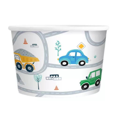 6 darabos autó és munkagép mintás papír fagylalt pohár, melyben a nyári melegben felszolgálhatod a kedvenc fagylaltotokat, de kínálhatsz benne édes vagy sós süteményeket, rágcsálnivalókat.