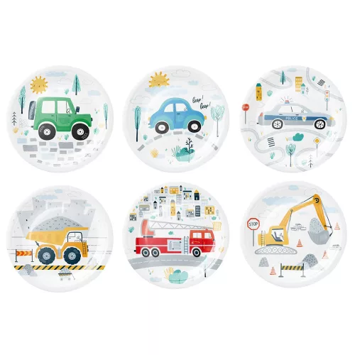 6 darabos autókat és munkagépeket mintázó papír tányér szett, mely igazi dísze lehet minden születésnapi bulinak.