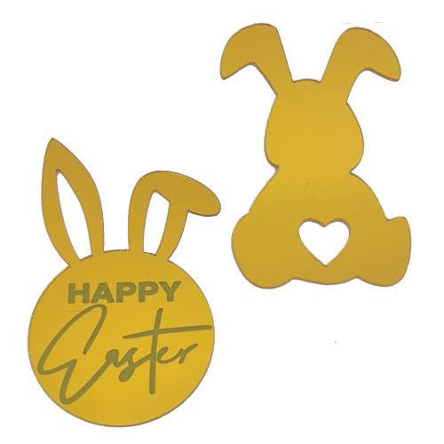 A szett két arany színű nyuszi formájú díszt tartalmaz: egy "Happy Easter" feliratos nyuszis fejet és egy aranyos ülő nyuszi sziluettet, amelynek szív alakú kivágása még különlegesebbé teszi a torta dekorációt.