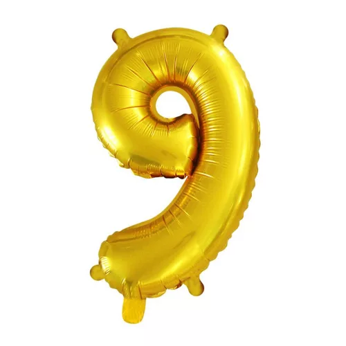 Arany színű, szám alakú fólia lufi „9” számmal, melyet használhatsz születésnapra, névnapra, vagy akár egy céges partykra is használhatod dekorációként.
