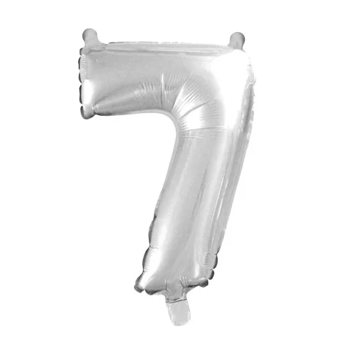 Ezüst színű, szám alakú fólia lufi „7” számmal, melyet használhatsz születésnapra, névnapra, vagy akár egy céges partykra is használhatod dekorációként.