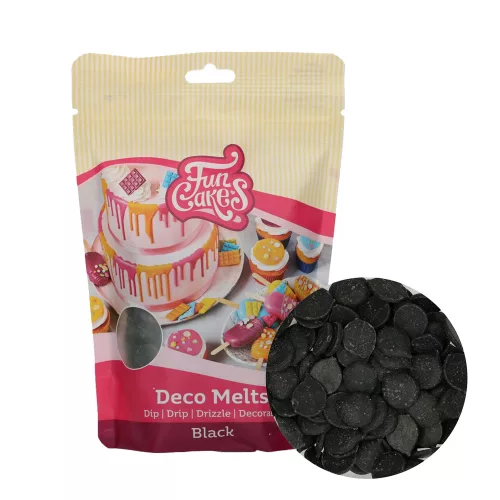 FunCakes Deco Melts fekete színű bevonó, melyet színezve vagy natúr is használhatunk csokinyalókák bevonására, gyümölcsök megmártására vagy éppen a tortákon lecsorgatva azok dekorálására.