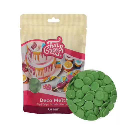 FunCakes Deco Melts zöld színű bevonó, melyet színezve vagy natúr is használhatunk csokinyalókák bevonására, gyümölcsök megmártására vagy éppen a tortákon lecsorgatva azok dekorálására.