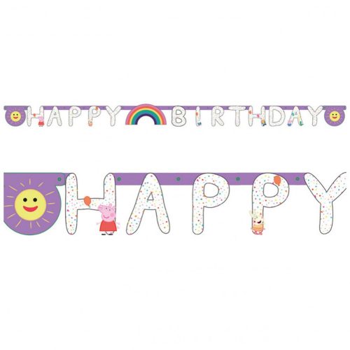 Happy Birthday feliratú, Peppa malac mintájú banner, zászlófüzér, mellyel igazán feldobhatod a születésnapi dekorációt.