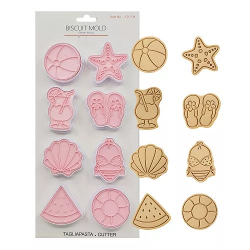 8 darabos különböző alakú, süteménykiszúró és sütemény nyomda, melynek segítségével igazán különleges, nyári, strandos témájú süteményeket tudsz készíteni.