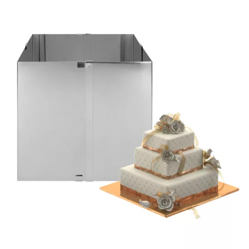 22 cm magas, állítható méretű, négyzet alakú tortakeret, melynek segítségével mindig a kiválasztott méretű tortát tudod elkészíteni otthon.