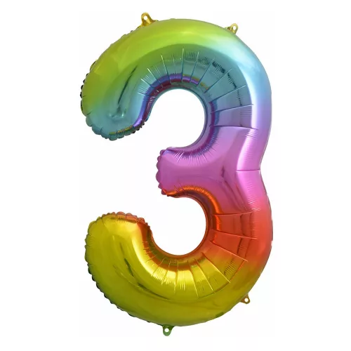 Szivárvány színű, szám alakú óriás fólia lufi „3” számmal, melyet használhatsz születésnapra, névnapra, de akár egy céges partyra is használhatod dekorációként.