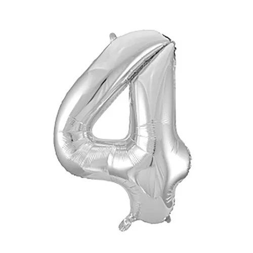 Ezüst színű, szám alakú óriás fólia lufi „4” számmal, melyet használhatsz születésnapra, névnapra, de akár egy céges partykra is használhatod dekorációként.