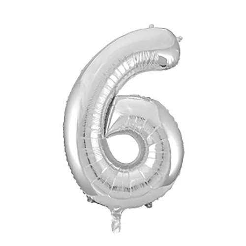 Ezüst színű, szám alakú óriás fólia lufi „6” számmal, melyet használhatsz születésnapra, névnapra, de akár egy céges partykra is használhatod dekorációként.