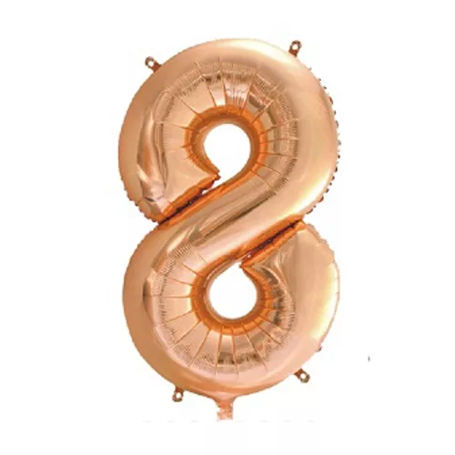 Rose Gold színű, szám alakú óriás fólia lufi „8” számmal, melyet használhatsz születésnapra, névnapra, de akár egy céges partykra is használhatod dekorációként.