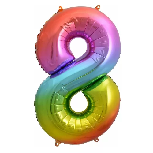 Szivárvány színű, szám alakú óriás fólia lufi „8” számmal, melyet használhatsz születésnapra, névnapra, de akár egy céges partyra is használhatod dekorációként.